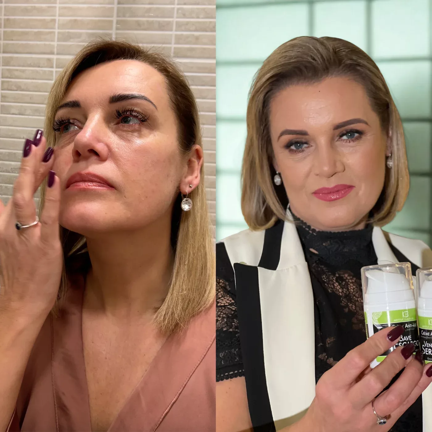 Antirynkkräm med extrakt av snigelslem (50ml): AQUA, GLYCERIN, DICAPRYLYL CARBONATE, GLYCERYL STEARATE, CAPRYLIC/CAPRIC TRIGLYCERIDE, METHYLSILANOL HYDROXYPROLINE ASPARTATE, BUTYROSPERMUM PARKII BUTTER, PENTAERYTHRITYL DISTEARATE, GLYCOSAMINOGLYCANS, TOCOPHERYL ACETATE, SODIUM POLYACRYLATE, SODIUM STEAROYL GLUTAMATE, CITRIC ACID, SALICYLIC ACID, SODIUM CHLORIDE, PHENOXYETHANOL, SODIUM BENZOATE, POTASSIUM SORBATE, CHLORPHENESIN, PARFUM.