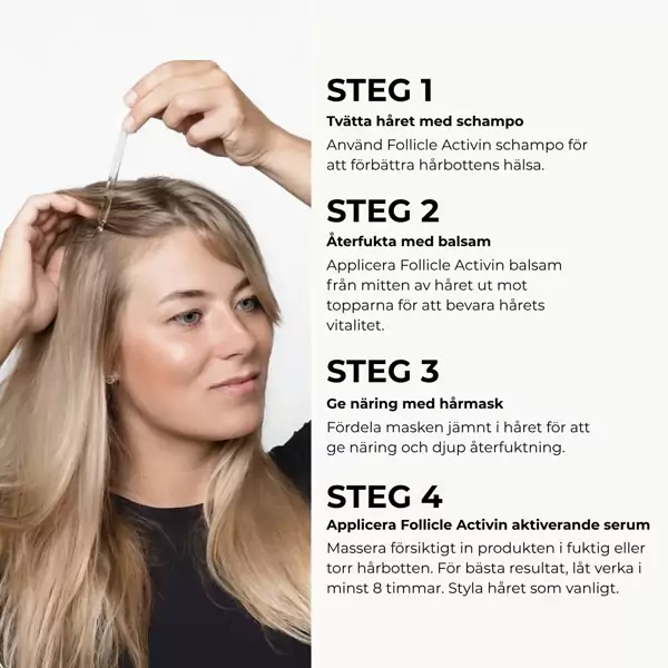 Professionellt Follicle Activin-schampo (250 ml): Applicera en liten mängd schampo i fuktigt hår och hårbotten. Massera varsamt utan att gnugga. Skölj noggrant med ljummet vatten för att avlägsna alla schamporester. Undvik kontakt med ögonen. Vid ögonkontakt, skölj genast med rinnande vatten. Förvaras torrt och mörkt i rumstemperatur (15–25 °C).